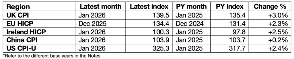 - UK CPI base 2015; EU HICP base 2015; Ireland HICP base 2025; China CPI base 2020; US CPI base 1982-84 (with exceptions)
