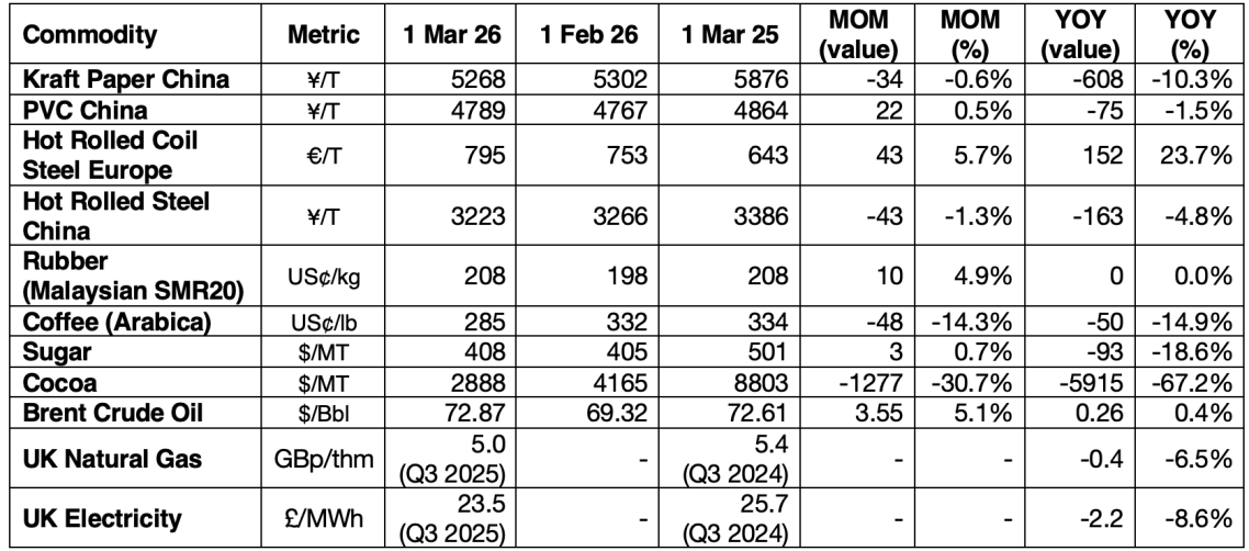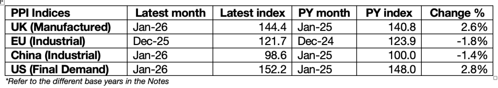 - Energy: As referenced last month, the escalation with Iran has created price spikes and volatility. The next release on the UK government data on energy prices is March. However, the volatility in the UK Gas and Electricity markets for producers was shown again in early March with a significant price spike (Gas and Electricity +50%). The UK is particularly vulnerable due to a lack of gas storage capacity.