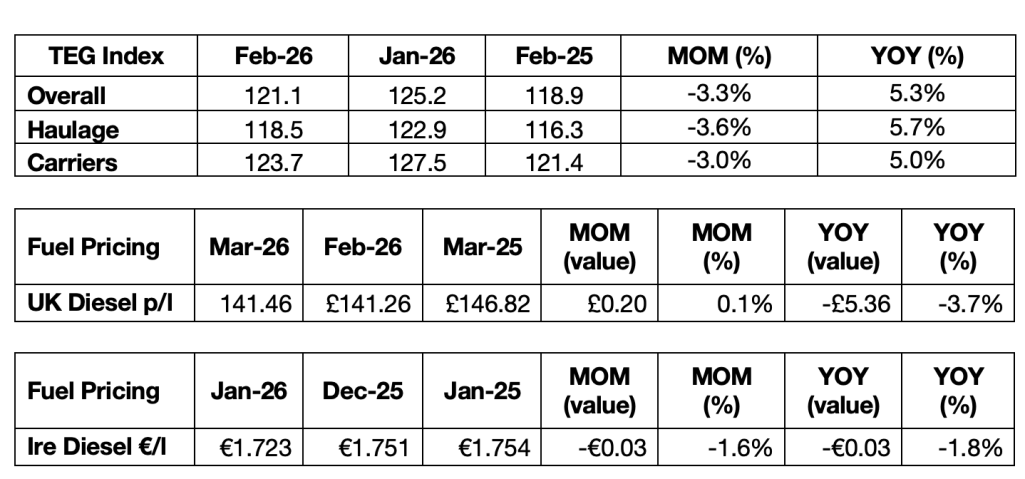 - Diesel: UK Diesel pricing held and the Irish is delivered later but is following the UK trend. However, the Iran Crisis has fundamentally changed the pricing in the oil market and that will determine fuel pricing during the next month over local conditions and demand.